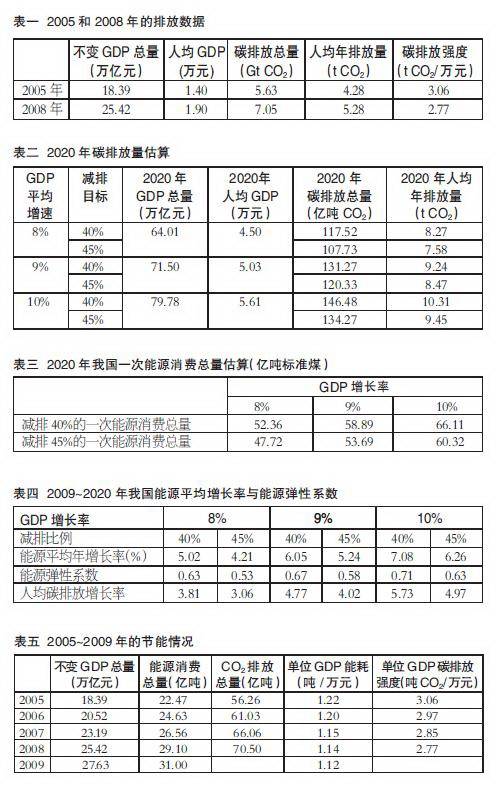 我国2005年的GDP总量是18.39万亿元,根据GDP逐年的增长率,2008年的不变价GDP为18.39×1.116×1.13×1.096=25.42万亿元(该年的名义GDP为31.40万亿元)。假定到2020年,我国GDP的平均增长率分别为8%、9%、10%,则2020年相对2005年的不变GDP将分别为64.01万亿元、71.50万亿元、79.78万亿元。根据美国橡树岭国家实验室的数据,2005年我国通过化石能源利用和水泥生产排放的CO2总共为56.26亿吨,碳排放强度则为56.26/18.39=3.06吨CO2/万元(RMB)。以2005年的排放强度为基准,我国2020年的碳排放强度将分别降低到1.683(3.06×0.55)至1.836(3.06×0.6)吨CO2/万元(RMB),可排放的CO2总量则增加到107.73(1.683×64.01)至146.48(1.836×79.78)亿吨,以联合国诓嫉脑げ馊丝诩扑悖该年我国的人均碳排放量将从2005年的4.28吨CO2,增加到7.58(107.73/14.21)至10.31(146.48/14.21)吨CO2。为便于验证,我们将有关数据列于表一、表二。