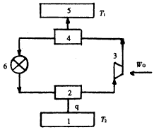 1-低温热源;2-蒸发器;3-压缩机;4-冷凝器;5-高温热源;6-节流膨胀阀