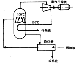 利用热泵蒸发原理(图3)用于各种稀溶液的浓缩。低温的稀溶液经换热器预热后进入蒸发器被浓缩,二次蒸汽经压缩机压缩,提高了压力、温度和焓值,然后将压缩后的蒸汽送回蒸发器加热室中,作为加热蒸汽用于蒸发料液,被加热料液吸收其潜热后又变成二次蒸汽,后者再进入压缩机压缩。如此不断循环,以少量高质能机械功、电能等,通过热泵蒸发装置把大量的低温位热能转化为有用的高温位热能加以利用,从而节省了大量生蒸汽,达到节能目的。