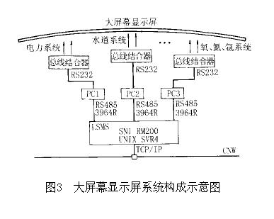 EMS的CRT上不能显示某一能源介质全厂系统的全貌,为便于值班人员在一旦出现涉及范围大的事件时,及时了解当时的系统情况,设置了“马赛克”的大屏幕显示屏,31.2m×2.5m(上海新光显示器厂供货)。大屏幕分成3个区,1区显示全厂供配电系统,2区显示全厂给排水系统,3区显示全厂煤气、蒸汽、重油、氧、氮、氩、压缩空气、环境参数等系统。屏幕上的灯光和数码管由每一区的一台工业微机管理,微机的信息来自EMS的LSMS工作站。系统见图3,其通信规约为3964R,接口为RS485,传输速率为9600b/s,数据位长8位,停止位1位,无校验。图示用的基本软件由制造厂提供,应用软件由用户自行编制。