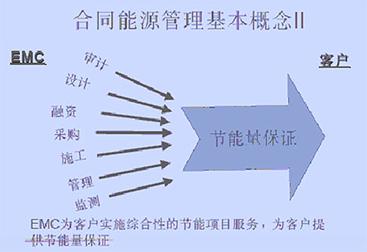 EMC公司提供能源用户能源审计诊断评估、改善方案规划、改善工程设计、工程施工、监理,到资金筹集的财务计划及投资回收保证的等全面性服务;采用适当的方法或程序验证评价节能效益,为能源用户提供节能绩效保证,再以项目自偿方式由节约的能源费用偿还节能改善工程所需的投资费用。