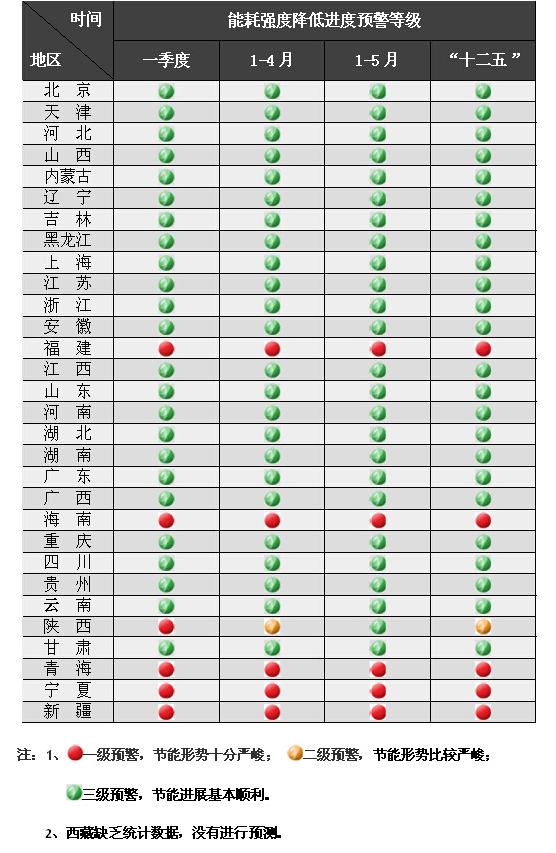近日,国家发布了各地区2014年1-5月节能目标完成情况晴雨表。通过对各地区节能形势进行分析,对照各地“十二五”年均节能任务,1-5月,福建、海南、青海、宁夏、新疆等5个地区预警等级为一级,节能形势十分严峻;北京、天津、河北、山西、内蒙古、辽宁、吉林、黑龙江、上海、江苏、浙江、安徽、江西、山东、河南、湖北、湖南、广东、广西、重庆、四川、贵州、云南、陕西、甘肃等25个地区预警等级为三级,节能工作进展基本顺利。西藏缺乏统计数据,没有进行预测。与1-4月相比,陕西地区叶级预警下降为三级预警。与“十二五”节能工作进度要求相比较,福建、海南、青海、宁夏、新疆等5个地区预警等级为一级,陕西预警等级为二级,北京、天津、河北、山西、内蒙古、辽宁、吉林、黑龙江、上海、江苏、浙江、安徽、江西、山东、河南、湖北、湖南、广东、广西、重庆、四川、贵州、云南、甘肃等24个地区预警等级为三级。