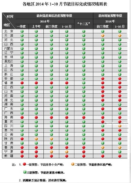 近日,国家发布了各地区2014年1—10月节能目标完成情况晴雨表。通过对各地区节能形势进行分析,对照各地“十二五”年均节能任务,1—10月,福建、海南、青海、新疆等4个地区预警等级为一级,节形势十分严峻;宁夏地区预警等级为二级,节能形势比较严峻;北京、天津、河北、山西、内蒙古、辽宁、吉林、黑龙江、上海、江苏、浙江、安徽、江西、山东、河南、湖北、湖南、广东、广西、重庆、四川、贵州、云南、陕西、甘肃等25个地区预警等级为三级,节能工作进展基本顺利>与前三季度相比,陕西由二级预警下降为三级预警。西藏缺乏统计数据,没有进行预测。