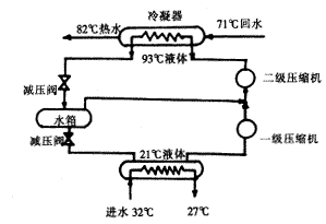 在化工生产过程中,往往产生大量低温排水(常指30~70℃),但因温度低而难以利用。国外已用热泵来回收此类废水及其他液体热量,并将其升温再用于其它加热过程或供取暖用。图5为水-水型热泵原理图。本例采用二级压缩,供给蒸发器水温为32℃,经一级压缩后为54℃的水。为了提高循环效率,将入水箱中部分水引至第二级压缩机中,经二次压缩后得到93℃的水。此水在冷凝器中冷凝时放出热量,将低温水加热至82℃供热用户使用。这种热泵可用于许多工业部门。