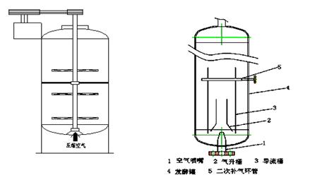 图1 机械搅拌发酵原理图 图2 气升式二次补气发酵原理图