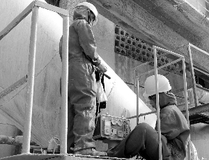 图为5月11日,环保检测人员正在尾洗风管取样平台用烟气采样器取样检测。T特约记者 黄耀振 摄)