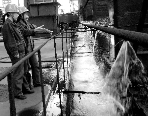 针对熄焦池泡沫经常溢出影响职工通行、污染环境的现象,宣钢焦化厂一号、二号焦炉职工积极献“计”,自制除泡沫喷泉,不费水、不用电便解决现场管理难题,成为环保生产、安全生产的又一亮点。图为兄弟单位组织人员参观学习这一小妙招。