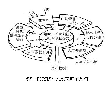 PICS是西门子公司开发的,它是通用的模块化的开放型软件包,包括基本的参数化处理、图示管理、曲线管理、归档管理、报表管理和网络通信管理等功能,示意图见图5。