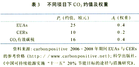从国民经济角度,无论是否能够实现市场交易,节能项目产生的CO2减排量都具有一定的环境价值。本研究主要通过锌脊际上不同的碳交易价格以及实施碳资源税国家的碳税,确定国民经济评价下的C02减排量价值。以配额为基础的碳交易,如EUAs,价格高于CERs;北欧4国(丹麦、芬兰,瑞典、挪威)在20世纪90年代的“绿色财政改革”实施的能源税收制度也可作为参考(见表3),重点考虑EUAs和碳税,通过赋权,可得到国民经济评价下的CO2减排量价值约为160元/t。