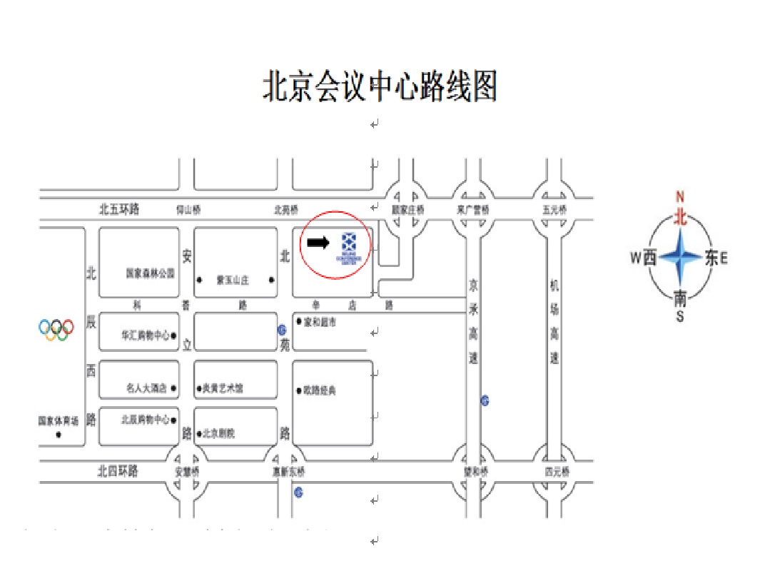 北五环自西向东或自东向西,在顾家庄桥东西均有“北京会议中心”出口,沿路标行驶,即可到达。