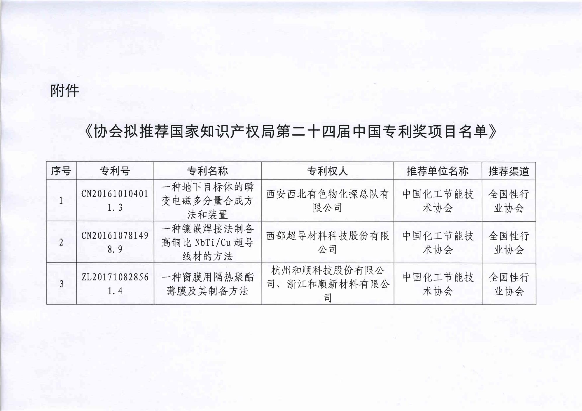 关于发布国家知识产权局第二十四届中国专利奖拟推荐项目名单的通知